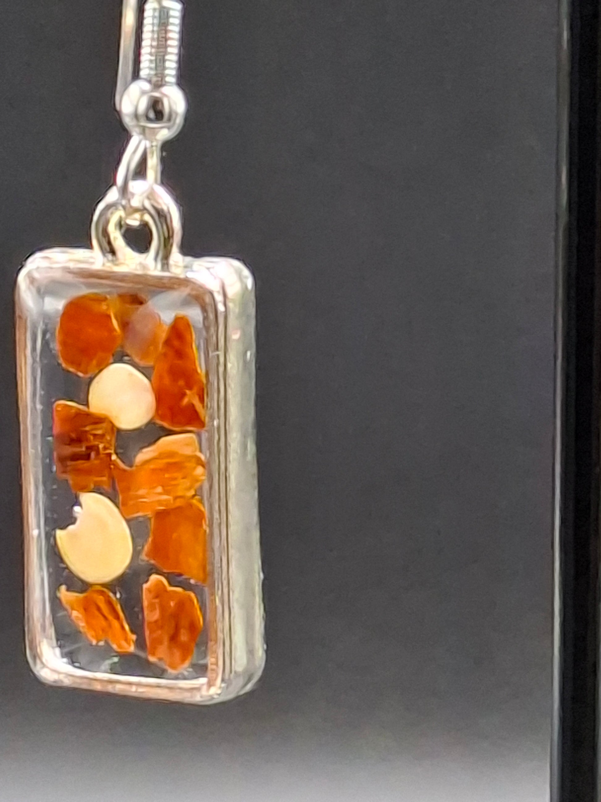 Expertly crafted, these real chilli flake earrings are set in smooth resin and hang delicately on silver hooks. The vibrant red brown and cream flakes make a bold statement, while the durable materials ensure long-lasting wear. Elevate any outfit with these unique and eye-catching earrings.