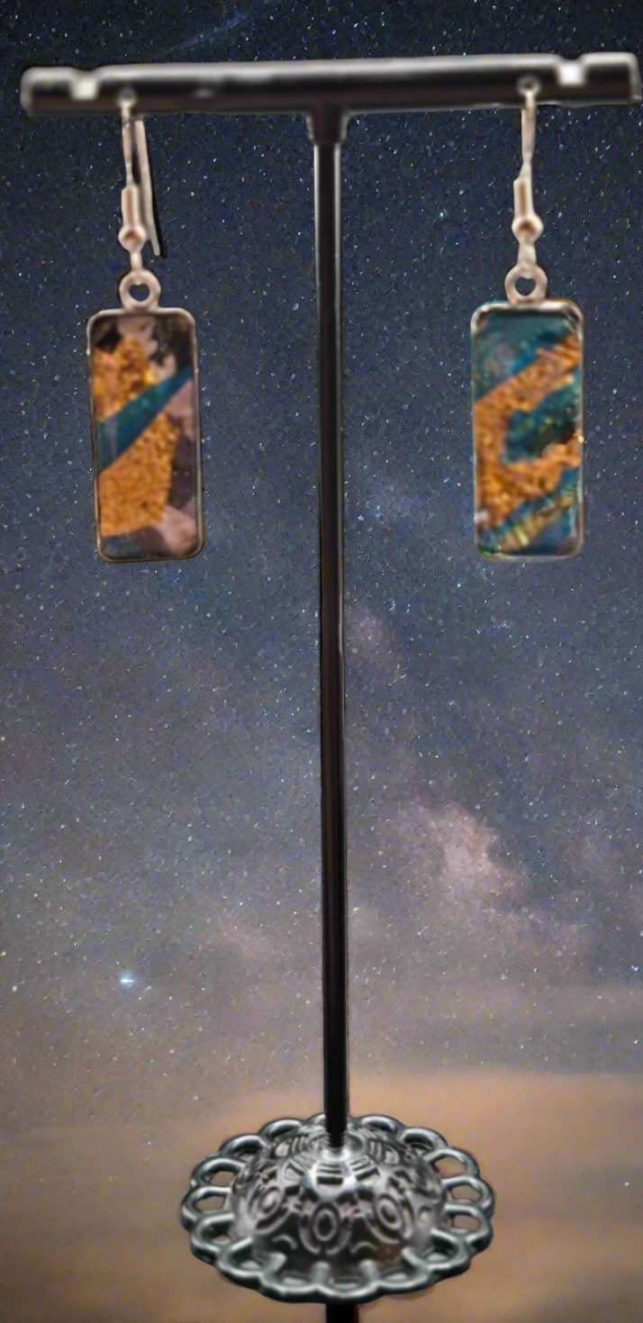 These hand-painted earrings are a unique addition to your jewelry collection. The silver-colored rectangle dome, set in resin, adds a touch of elegance while the silver hooks provide a secure and comfortable fit. Elevate your style with these one-of-a-kind earrings.