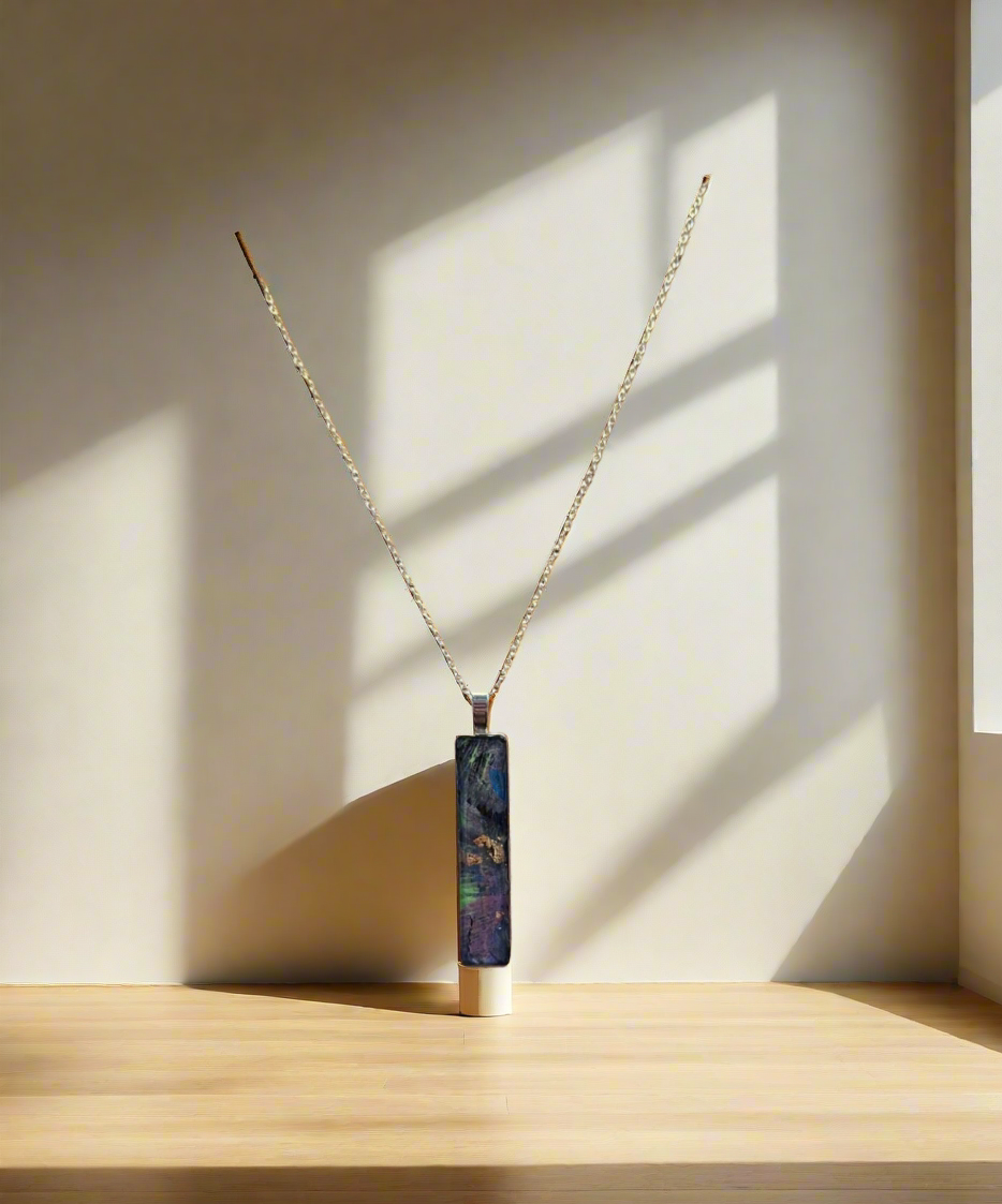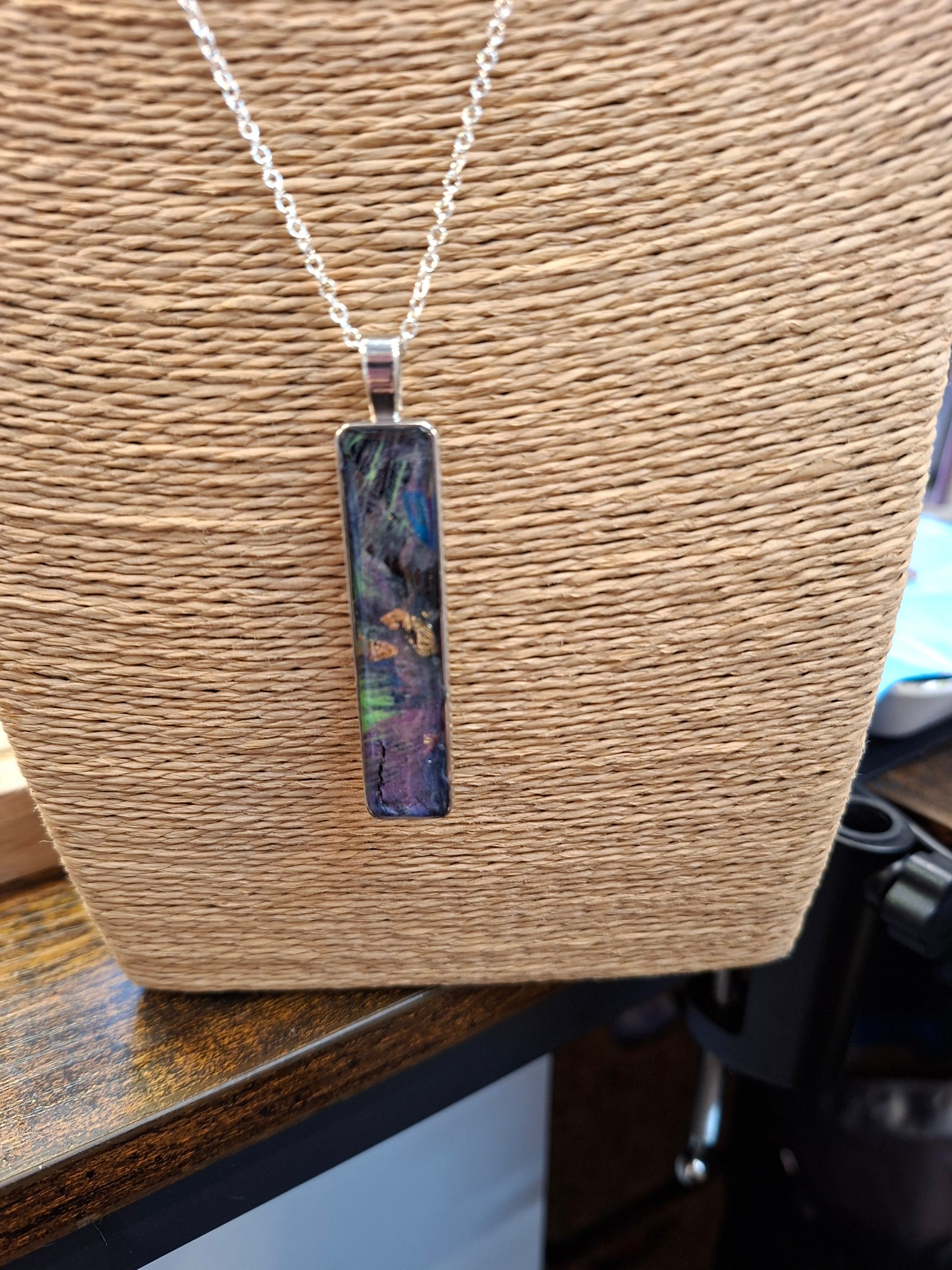 Expertly crafted and uniquely designed, our hand painted pendant are set in high-quality resin, giving them a durable and glossy finish. The beautiful rectangle shape is accentuated by its silver chain, creating a stunning and versatile accessory for any occasion. Elevate your style with our one-of-a-kind pendants.