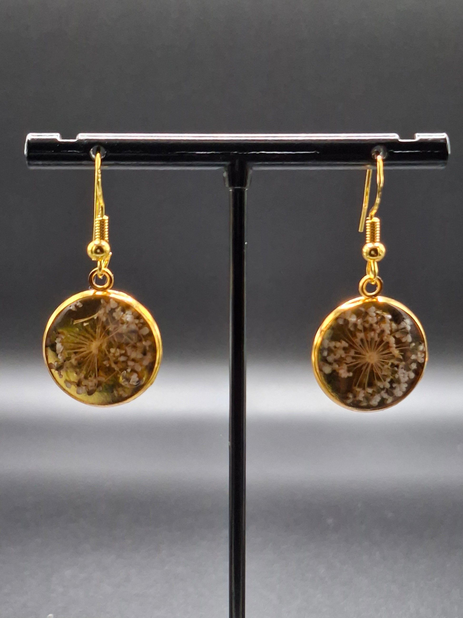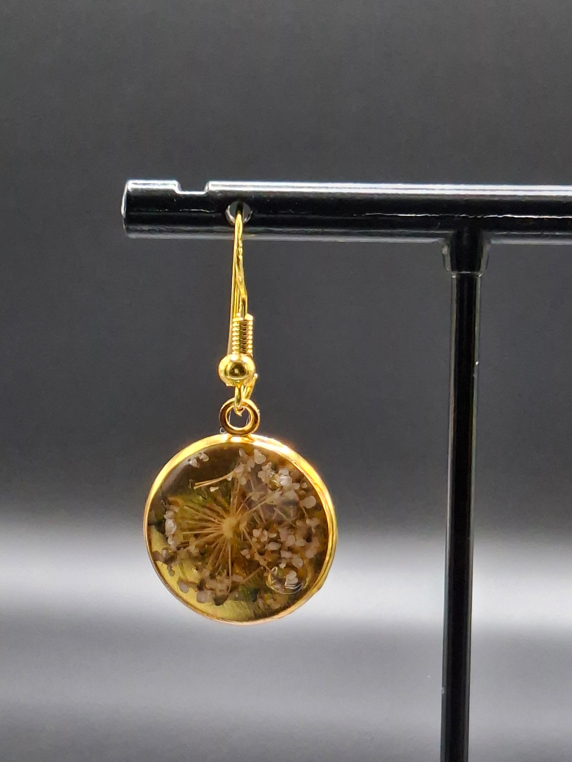 Add a touch of nature to your style with our real flower earrings set in resin. The elegant gold color dome and hooks elevate any outfit. Handpicked flowers preserved to last, making each piece a unique accessory.