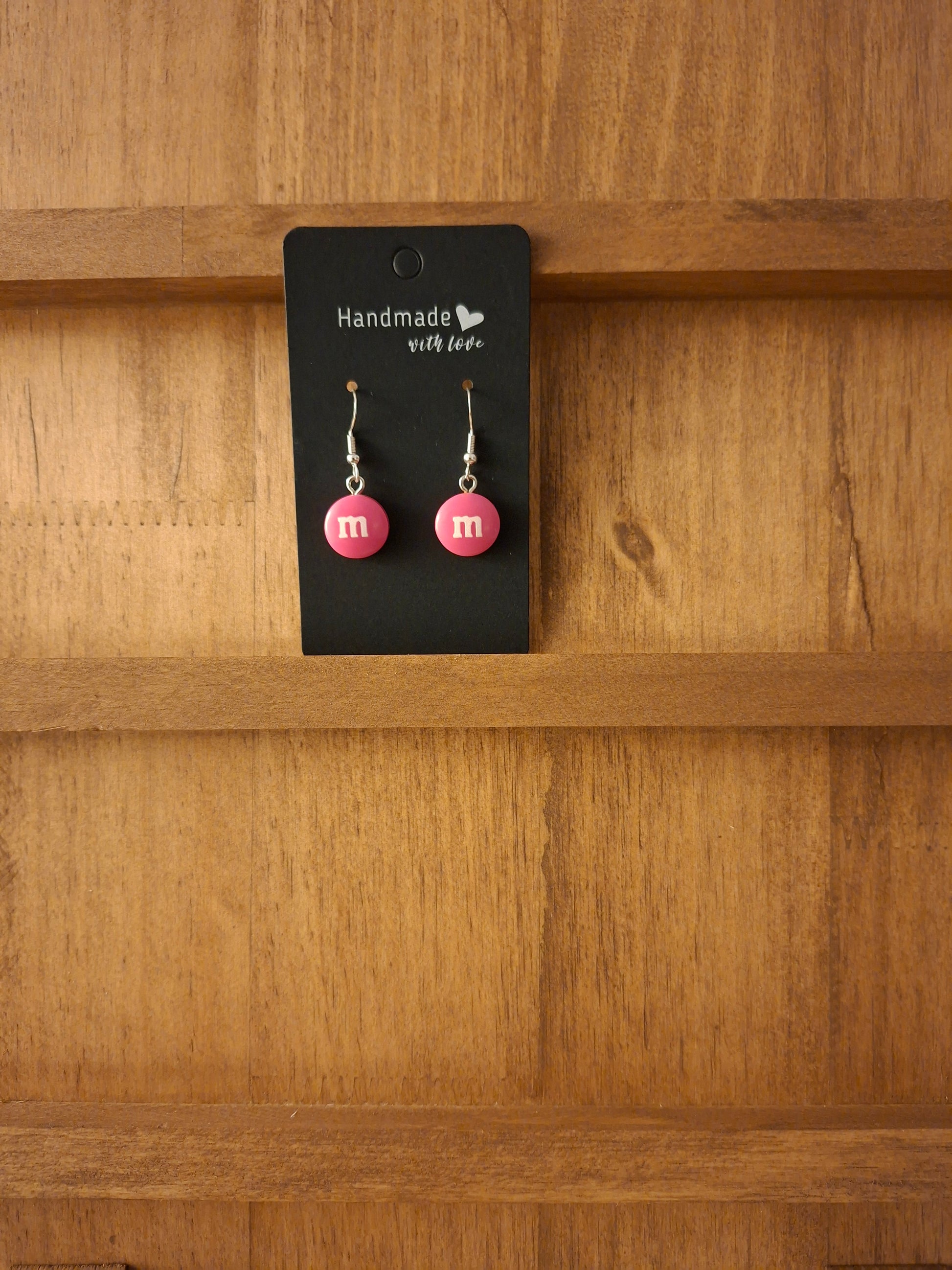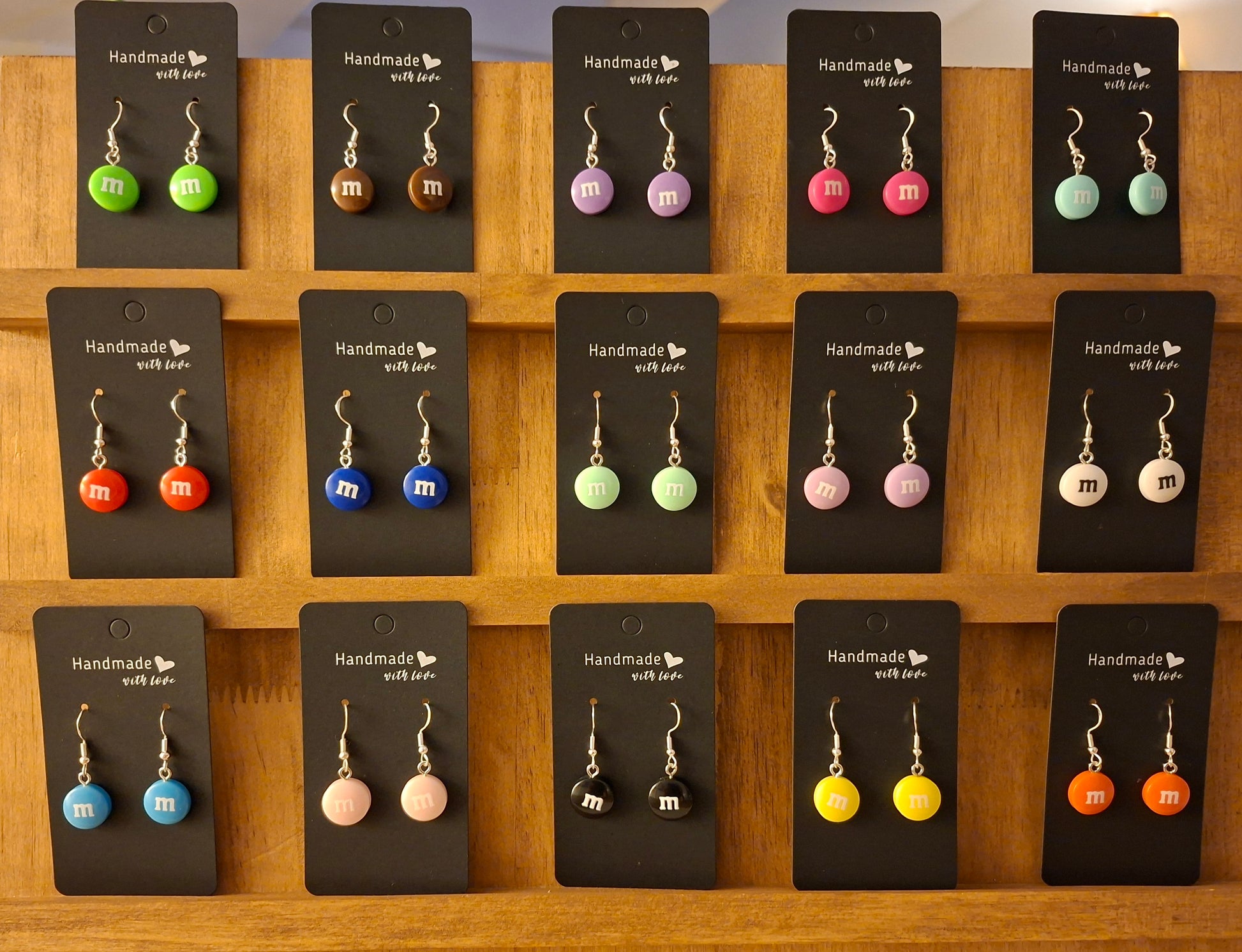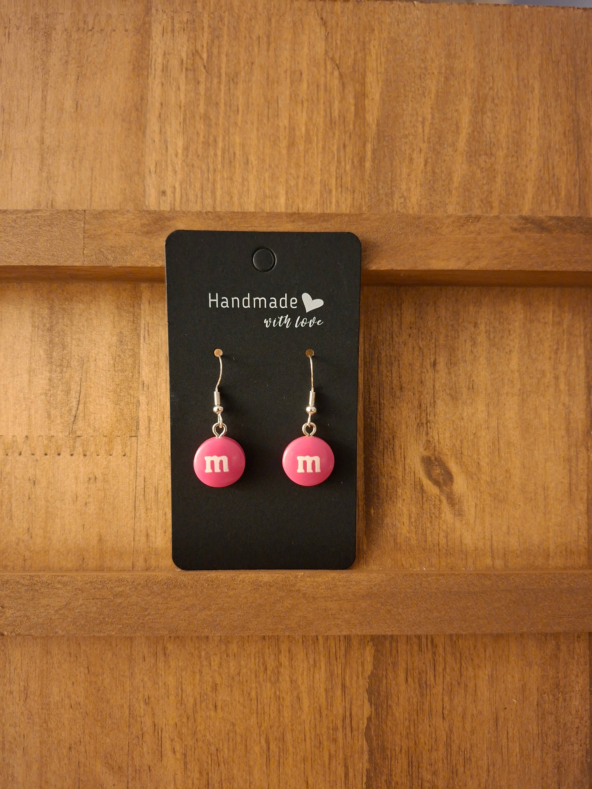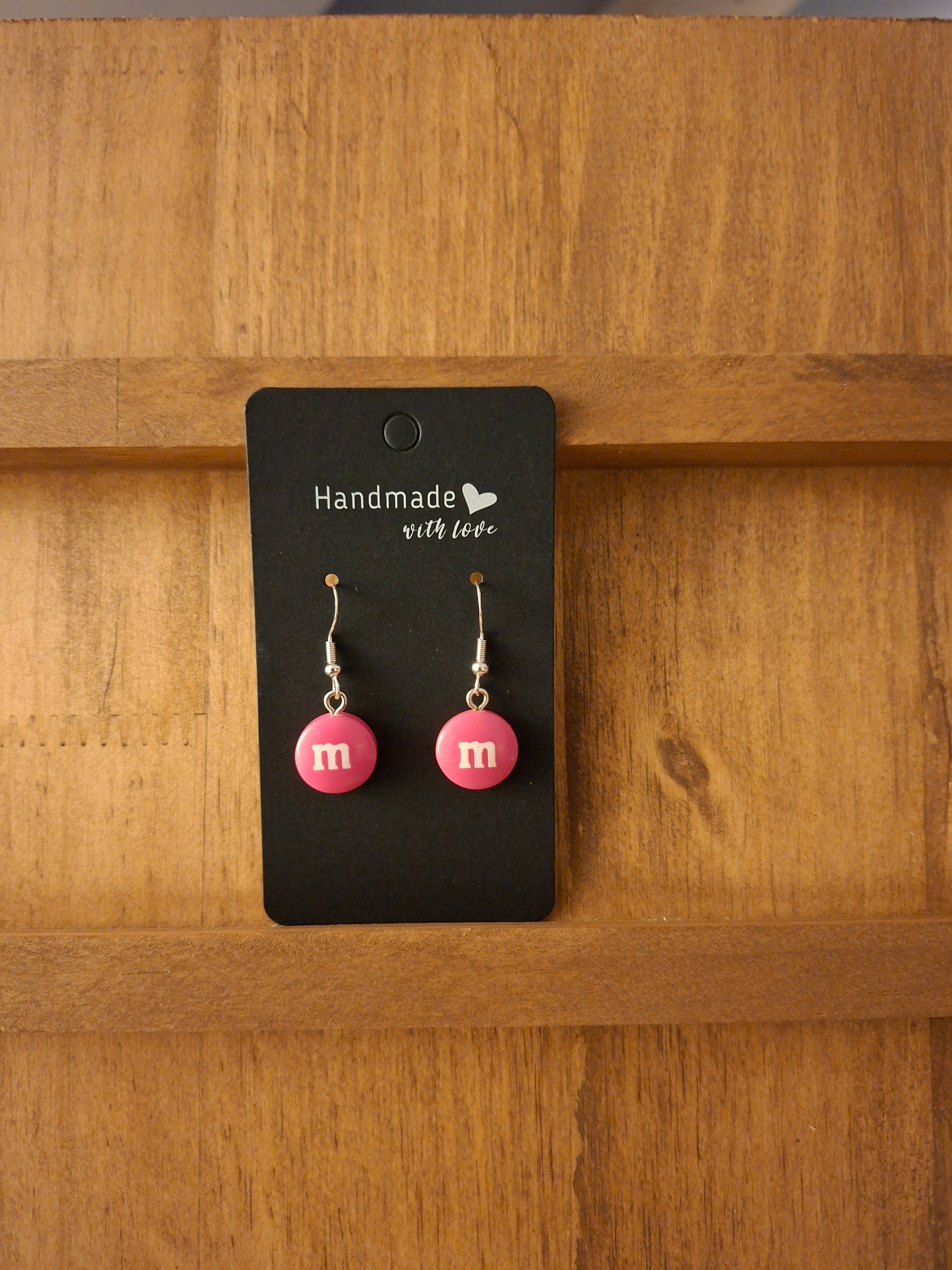 Expertly crafted, these M&M dangle earrings are made with polymer clay and resin on silver hooks. With their unique design and lightweight feel, they are the perfect accessory for adding a touch of fun and color to any outfit. Elevate your style with these statement earrings.
