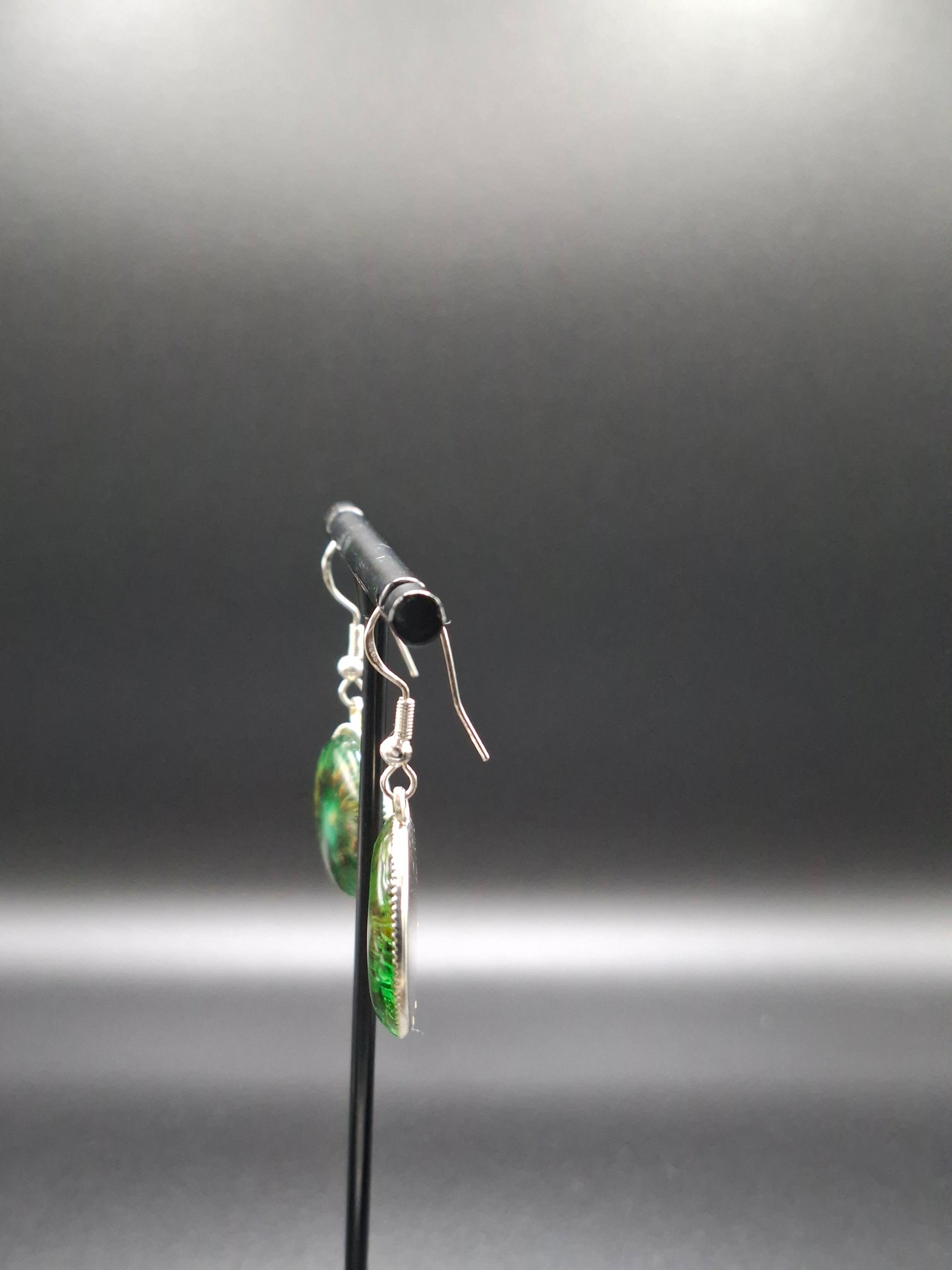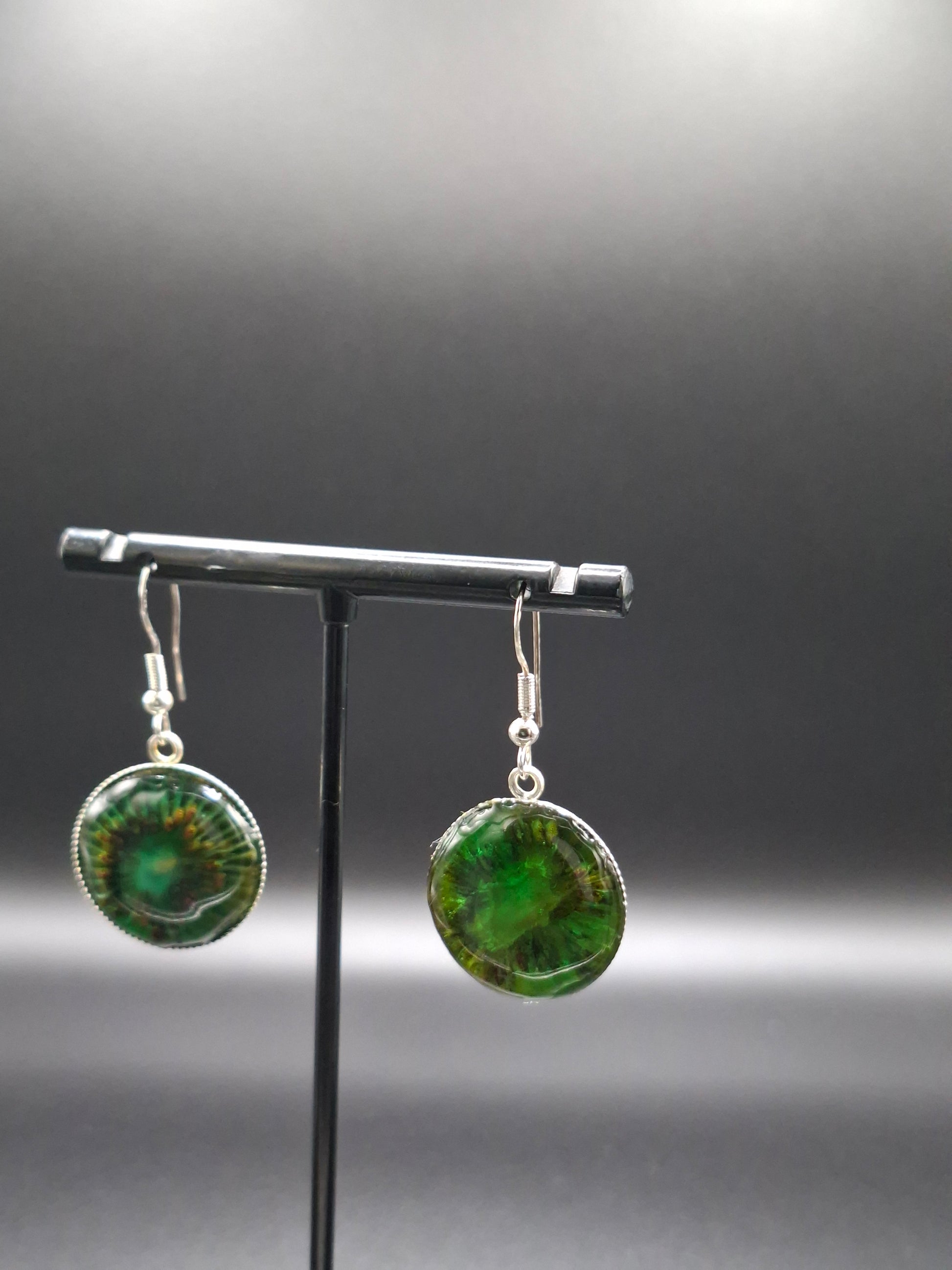 These real kiwi earrings are set in resin on silver hooks, creating a unique and eye-catching design. The round dome shape is both stylish and versatile, perfect for any occasion. The use of real kiwi adds an organic touch to your jewelry collection.